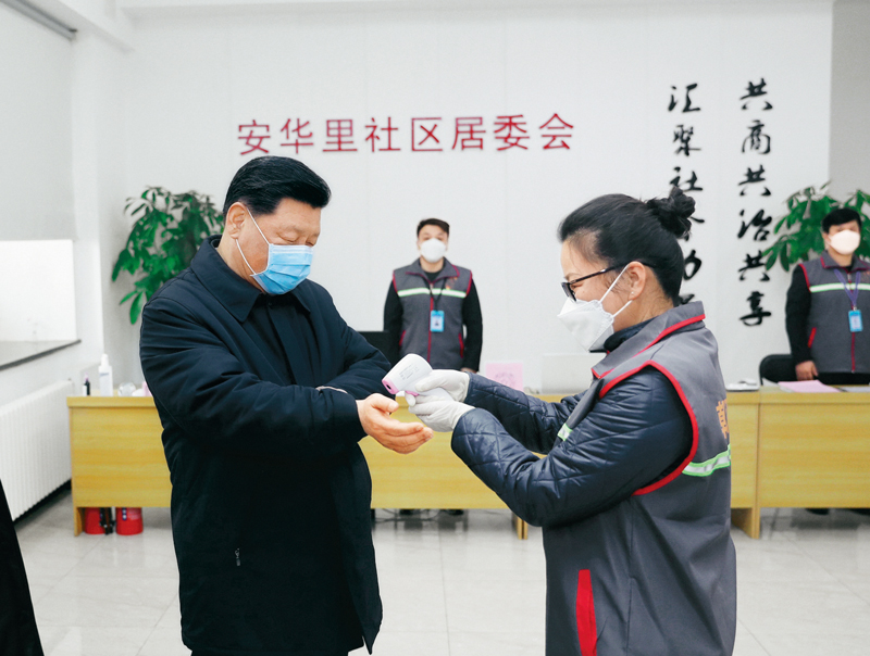 2020年2月10日,中共中央總書記、國家主席、中央軍委主席習近平在北京調研指導新冠肺炎疫情防控工作。這是習近平來到朝陽區安貞街道安華里社區,了解基層一線疫情聯防聯控情況。新華社記者 鞠鵬/攝